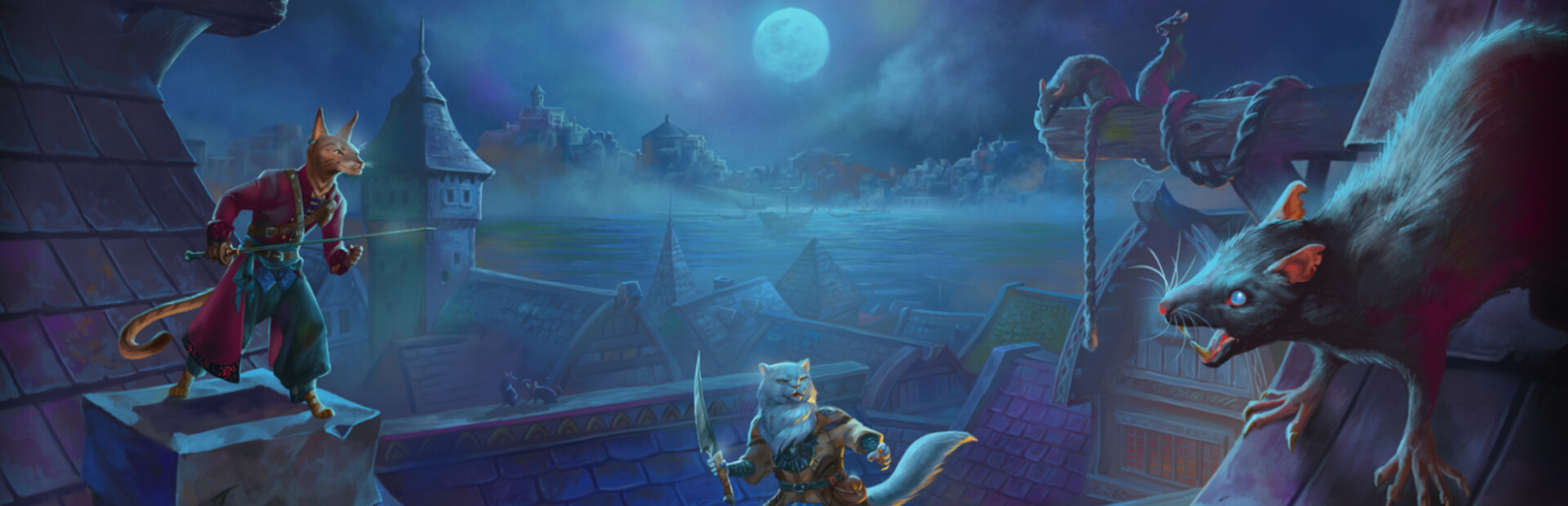 Go for a stiff pint of milk, gamble for the valuable shiny bells once can make a fortune from or entertain each other with tall tales of daring adventures. Explore the dark underbelly of the harbor, where illegal rat-races and haunted cellars invite the brave catventurer, enticing them with secrets and riches. Or roam the roofs of the sleeping city, going where no human will follow as the city lies before you, filled with potential to experience new excitement.
