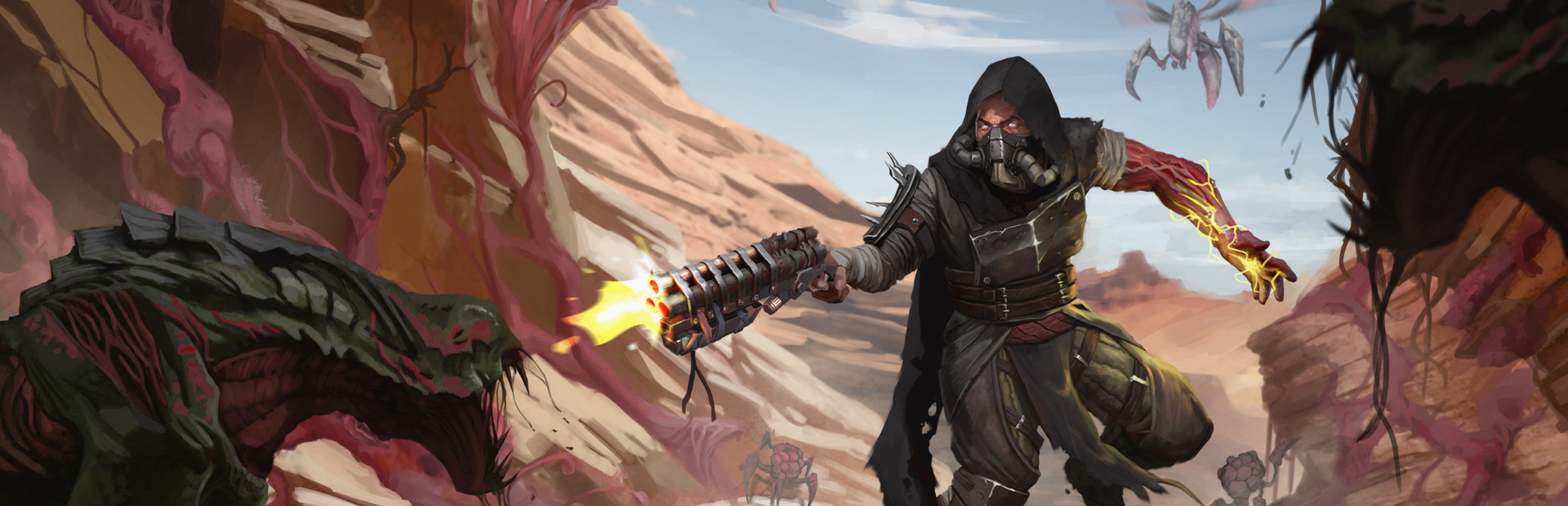 Embark on a dangerous journey, roaming a vast, bizarre wasteland filled with otherworldly fauna and flora, unlike anything you have ever seen before and uncover all its mysteries. The world is steeped in dark humor and does not play by any rules. Most of the time.