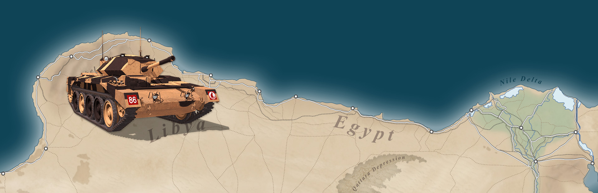 Attack at Dawn: North Africa features a large map, covering a distance of almost 2000 kilometers and you can use the Scenario Editor provided within the game to create your own scenarios anywhere on this large battleground. Starting at the bay of Sirte in Libya and spreading to Suez Canal in Egypt, the terrain varies between sea, desert, mountains, wadis, ports... There is one long asphalt road, "Via Balbia", spanning the whole length of the map, and a handful of well-known desert tracks leading towards the deep Sahara.