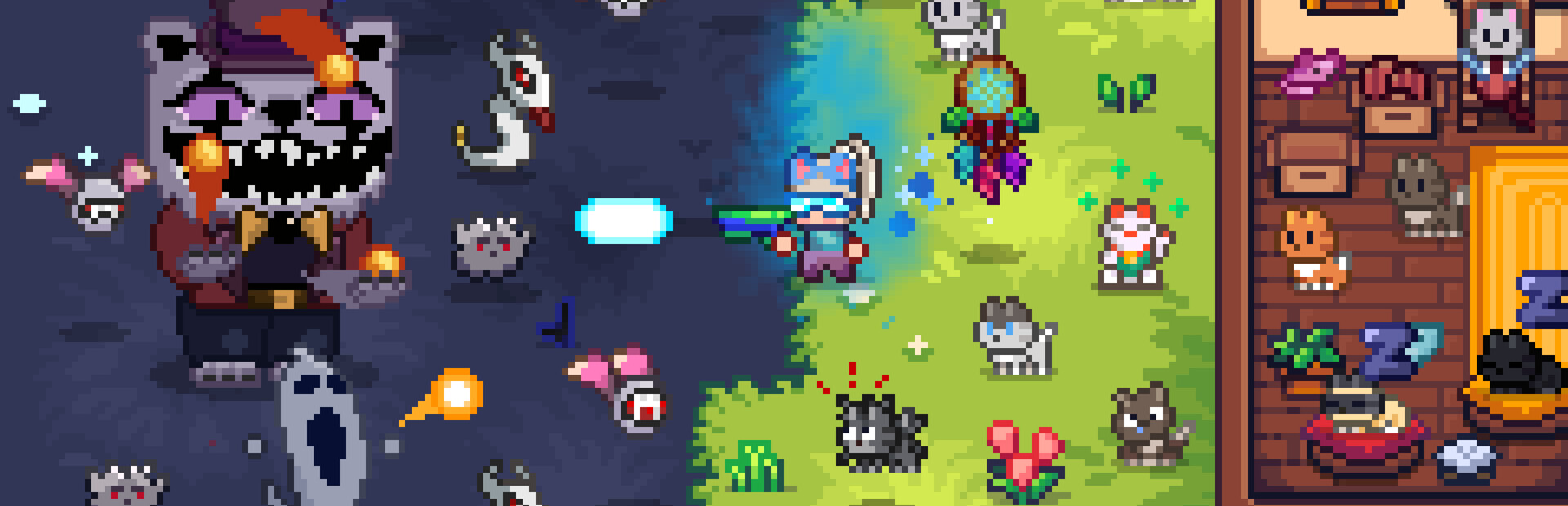 BabushCats is a pixel-art, top-down simulation game with elements of combat. Take on the role of a wholesome grandma who runs a shelter for cats living in the neighborhood. Expand and customize your home as the number of your lovely pets grows. At night, prepare to battle your cats' nightmares and stop them from disturbing their sleep! Defeat mysterious nightmare bosses and find your ultimate cat companionship.