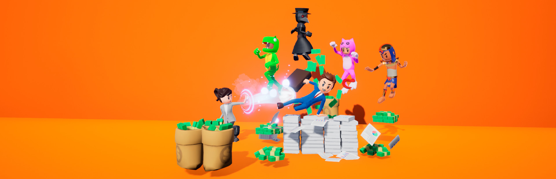 Bankers & Bonkers is a team-based multiplayer game where two teams will fight using power-ups to get the money case found in the map and fill it as much as possible with the money spread around the map. The team that brings more money to their base wins the game. Play with your friends as a team and collaborate to get as much money as you can. You only have to get your hands on the briefcase and fill it as fast as possible. Don't forget your enemies, they will do everything to steal the briefcase and bring it to their base.