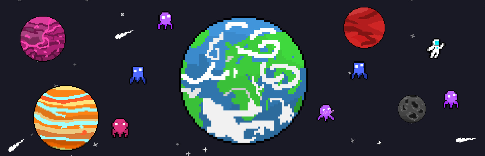 However, your spaceship has CRASHED, leaving you stranded in space. Worst of all, these weird SPACE SQUIDS have all come out of hiding to steal your precious limited supply of OXYGEN. You will have to maneuver from planet to planet using your trusty SPACE GUN & mighty GRAPPLING HOOK to make it out alive. With a never ending assault of squids and an ever-increasing difficulty, you will have to master these mechanics in order to survive. Hopefully by the time you get back home, your cat, Joe, hasn't emptied out the kitchen.