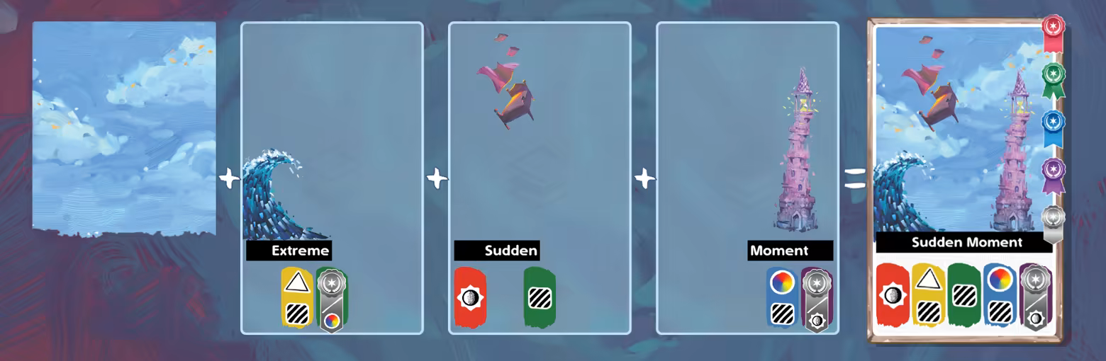 In Canvas, you combine transparent Art Cards to create unique paintings, with each card adding elements and icons that shape your final score. Strategic choices about which cards to layer, and which icons to reveal or cover, are key to meeting scoring conditions and earning ribbons. Each painting contributes to your score while also becoming a one-of-a-kind masterpiece with its own title.