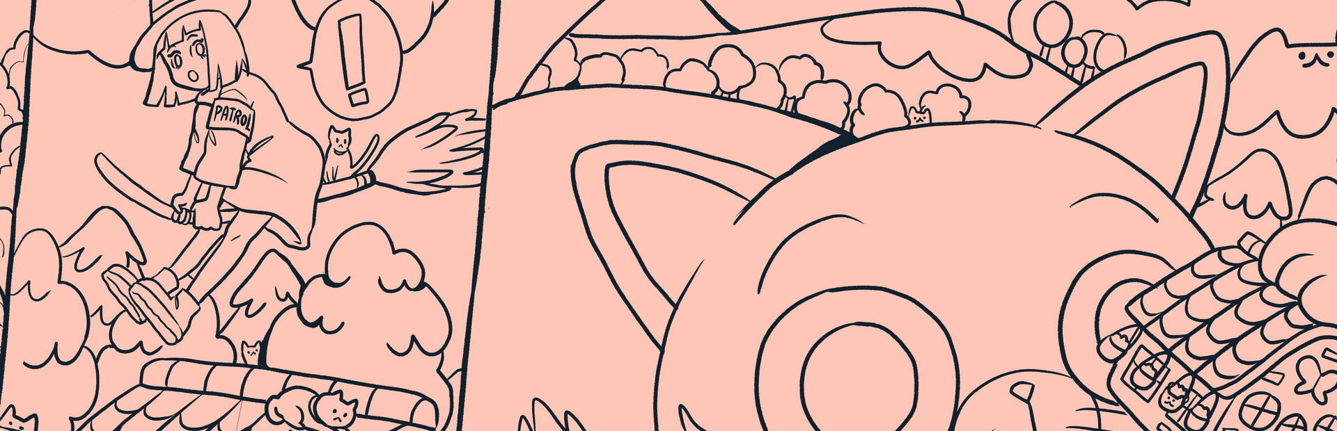 "Giant Cat" unfolds across four pages of silent comic panels by Kathrinna Rakhmavika, offering a heartwarming tale about a giant cat causing chaos in a village. A young witch must step in to resolve the situation. Throughout each page, we've hidden numerous cats for you to find while enjoying the story.