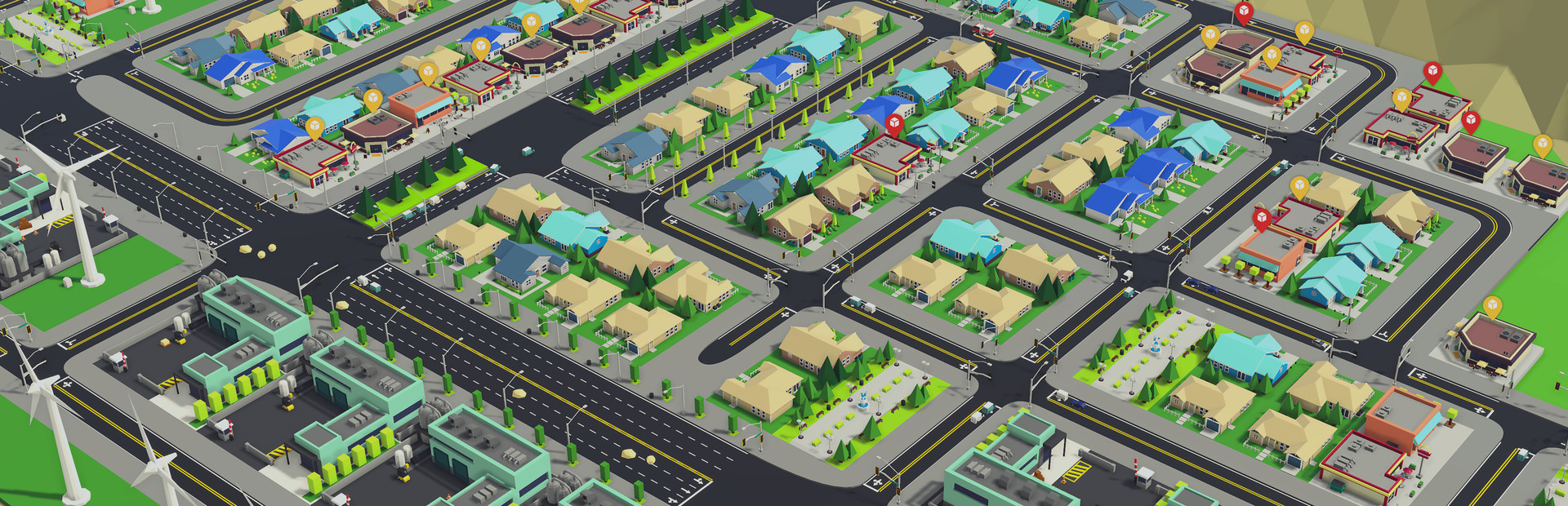 - Modern, hand-crafted, low-poly style building models and structures.