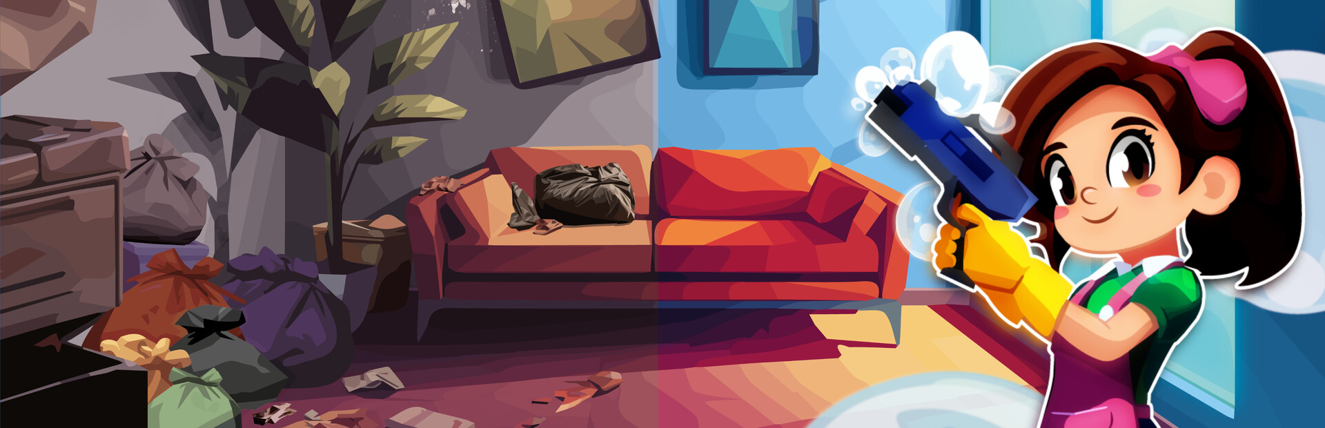 Your journey begins with the Bluegun, a powerful cleaning tool designed to scrub away filth and obliterate junk. Fire bubbles to wash walls, furniture, and floors, or shatter clutter into satisfying particles. Every cleaning action earns experience points, allowing you to unlock upgrades that make your tools even more effective.