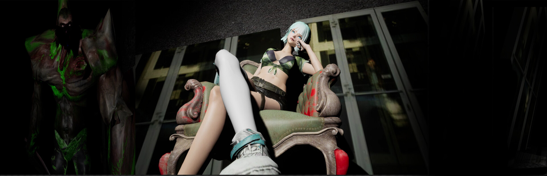 Damaged buildings, scattered army equipment, and what seems to be hiding in the darkness.