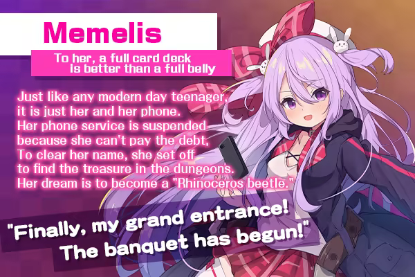 The protagonist, "Memelis," heads to the dungeon in search of treasure to pay off her debts.