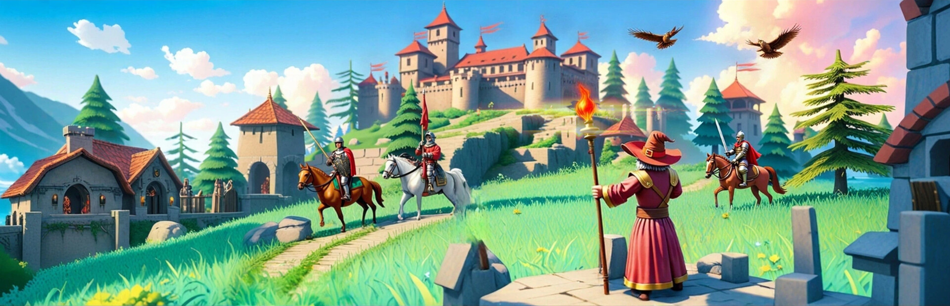 Your hero enters the playing field via the main fortress. Heroes can either fight and conquer villages, search for treasures, hunt monsters or occupy magical rune fields.