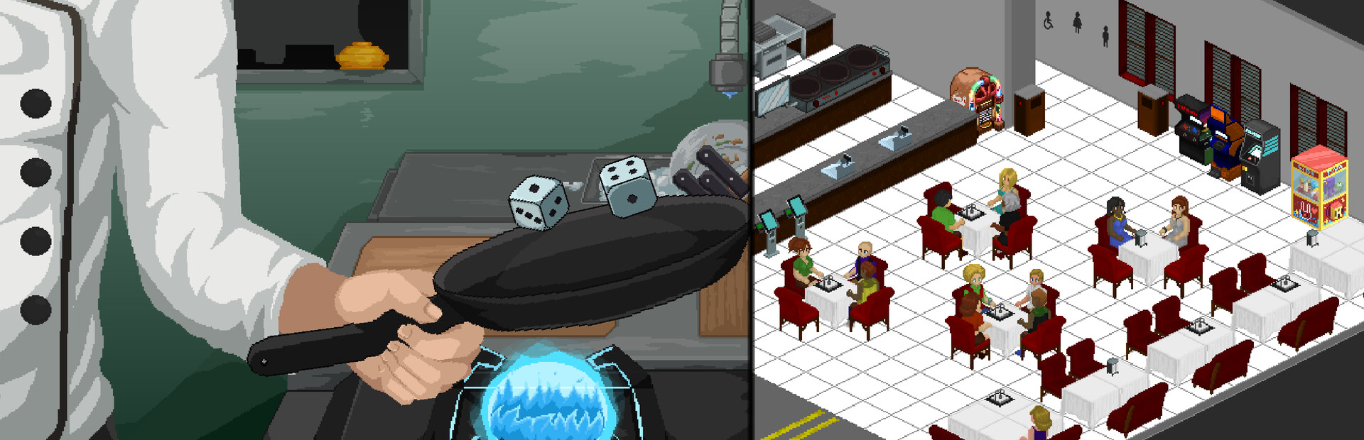 Open your dream business, upgrade and equip your kitchen, level up employees to customize their dice.