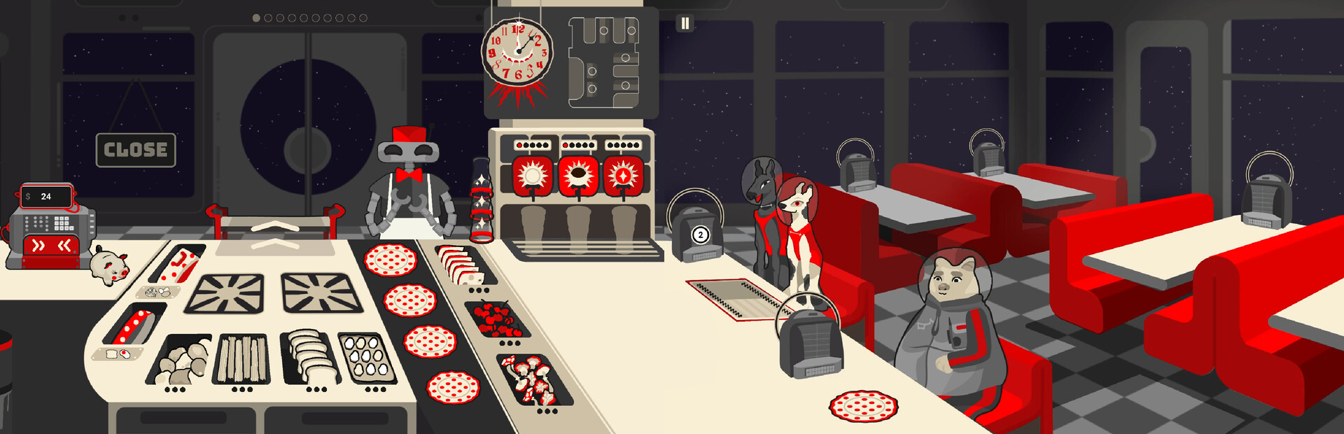 Manage a small 1950s-reminiscent diner that orbits the planet in open space. Based on the planet's rotations, the inside environment changes, creating three different playing conditions. Learn to manage the resources carefully and lead the diner to success!