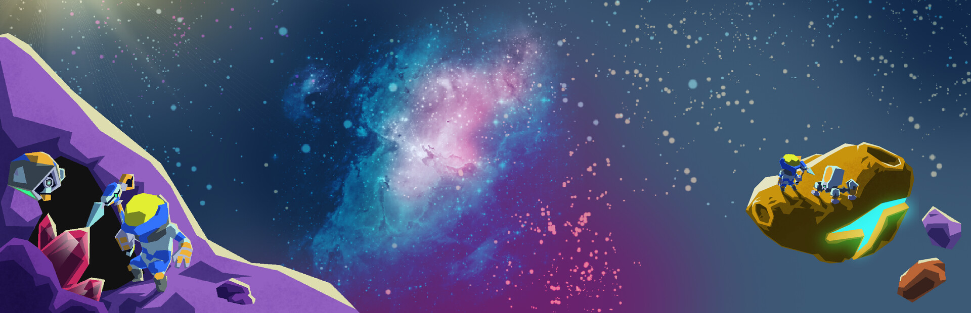 There's something more than large rocks in this field. Gear up and explore the cosmos with your friends one rock at a time to find the resources and answers you need. A beautiful soundtrack by Curtis Schweitzer will accompany you on your expeditions.