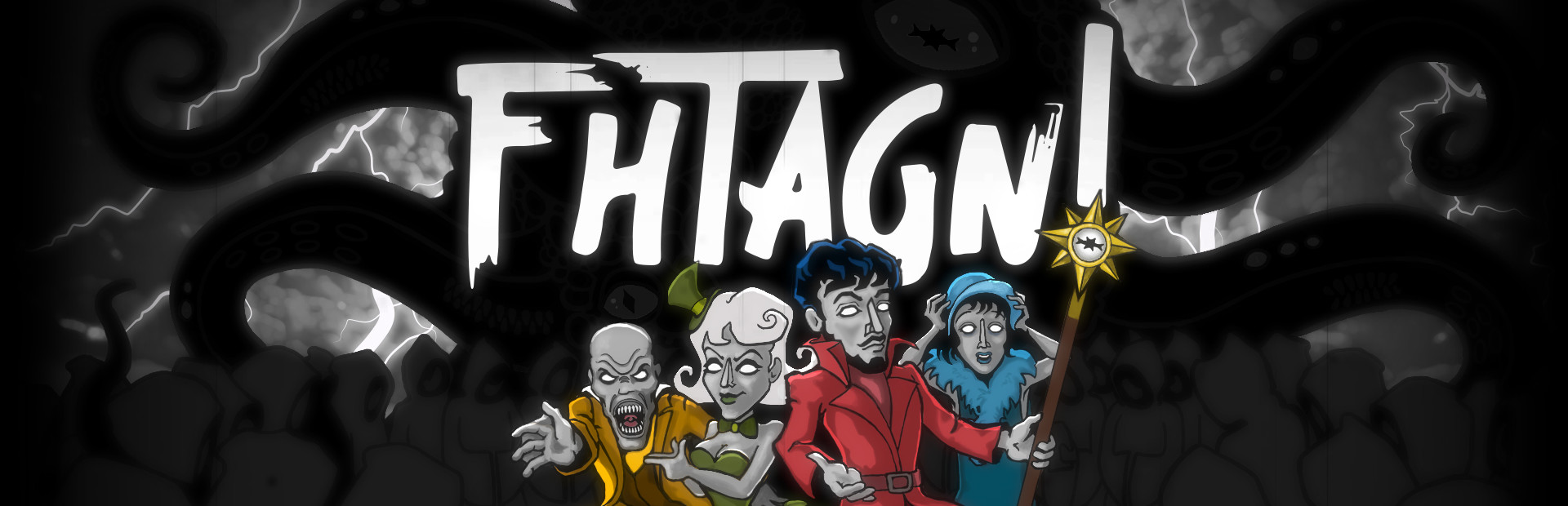 Dubbed the "funniest take on mystic doomsday cults in years", Fhtagn! is a text based adventure game, where choices matter! Play as one of four cultists intent on destroying the world by summoning an Ancient Horror. Decide how you will be preparing for the final ritual by visiting various locations in the unsuspecting town of Arkham and navigating iconic Lovecraftian events. Battle investigators, gangs, corrupt cops and horrors from the Depths to bring about the end of the world!