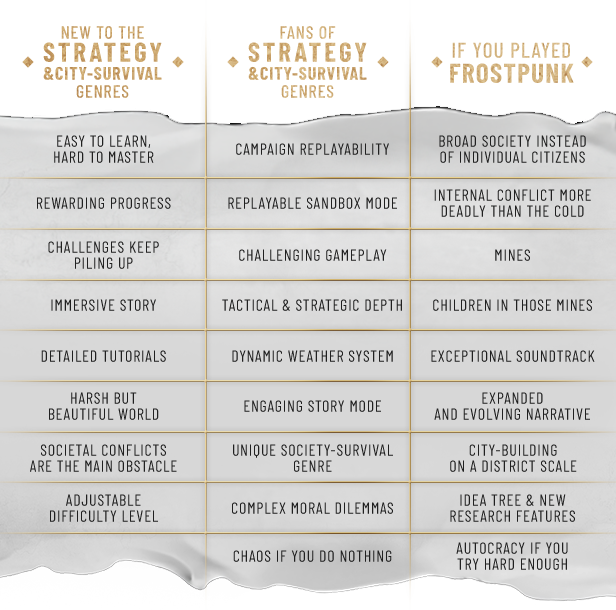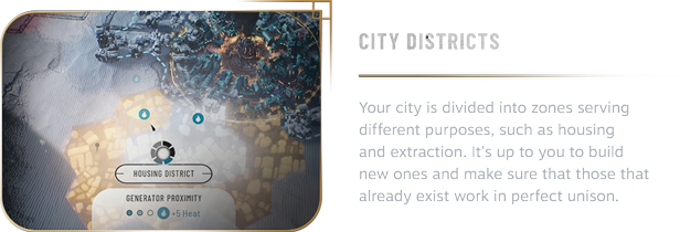 Frostpunk 2 elevates the city-survival genre to a new level. Take the role of a Steward and lead your city through a cascade of calamities taking place in a postapocalyptic, snowy setting. Build large city districts with their string of endless needs and demands. Navigate through conflicting interests of factions that populate your metropolis. As the needs of the city grow and factional power at its core rises, only you can steer the society towards an uncertain future.