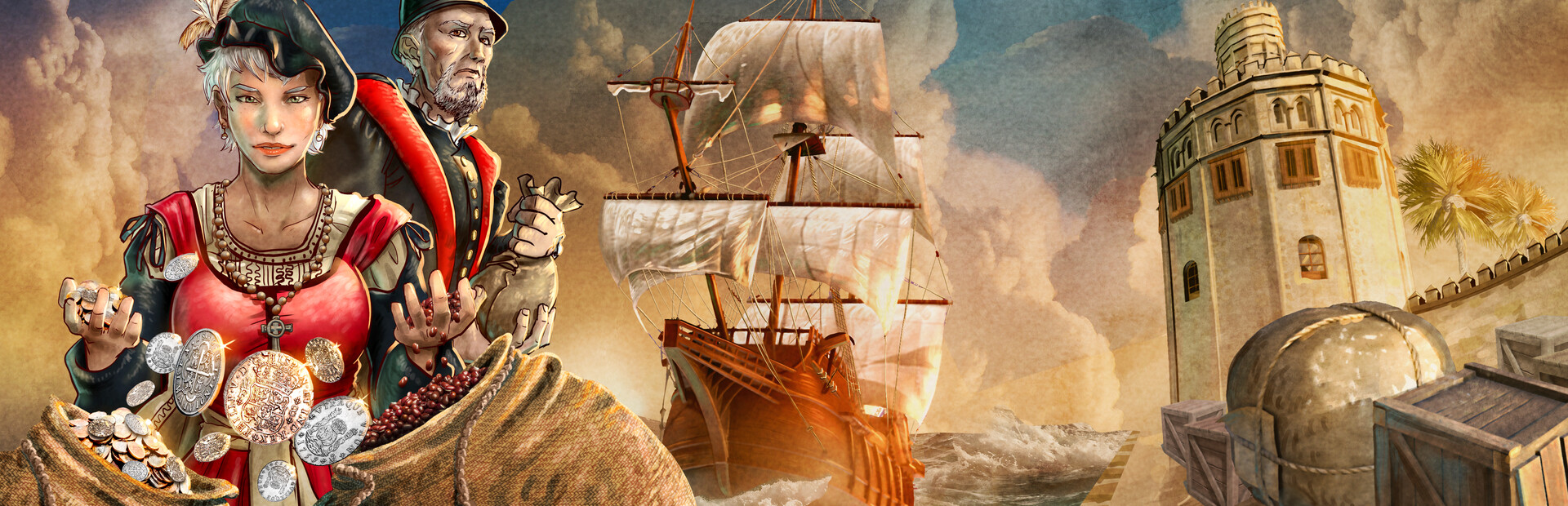 Galleons of Fortune is a trade management and simulation game set in 16th-century Seville during the golden age of the Spanish Armada and the Treasure Fleet. In this fascinating game, you take on the role of a visionary and bold merchant in charge of a thriving business that connects the Old World to the riches of the New World.