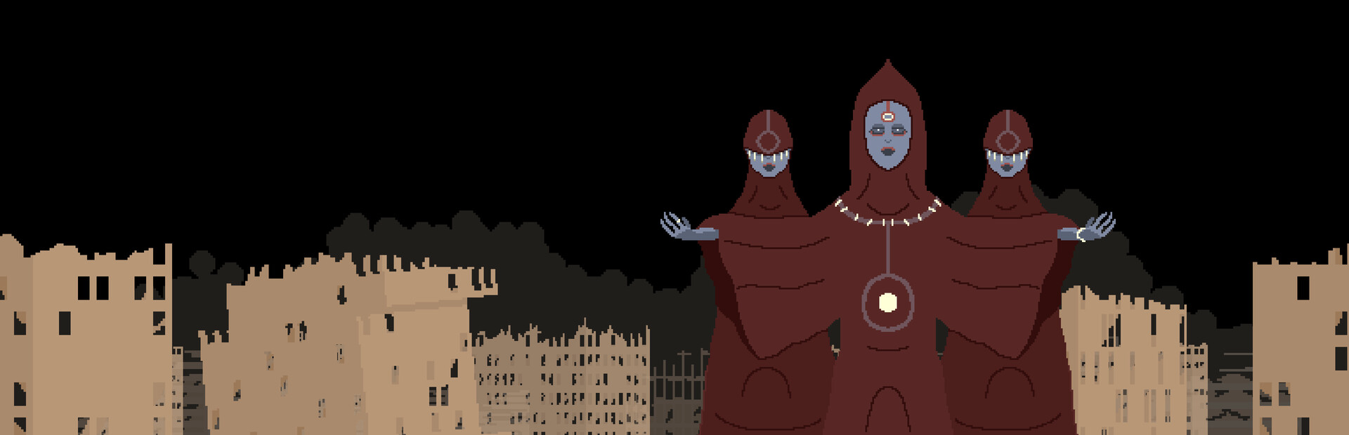 Atmospheric pixel art — grounded UI, tense tone