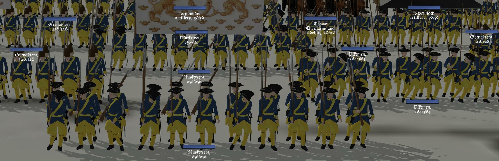 The infantry, cavalry, and artillery of the army deal different amounts of damage to each other. Obstacles such as chevaux de frise protect the defending army from cavalry. Walls and wagons also protect them against artillery and musket fire.