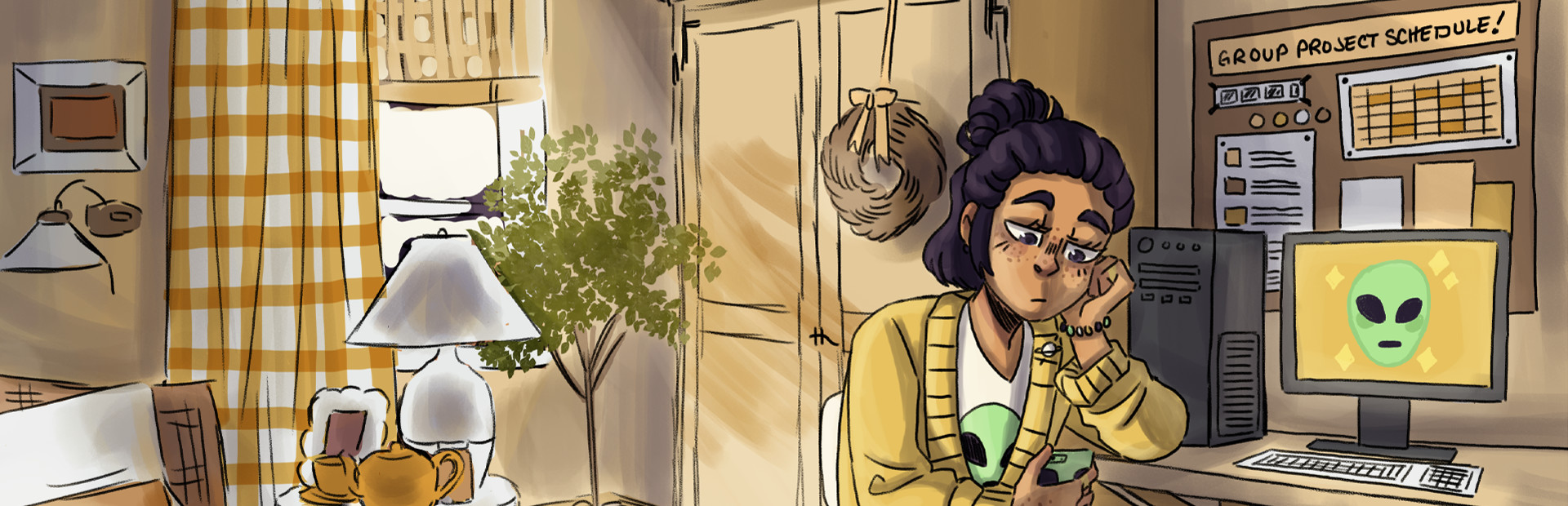 Group Project Simulator is a visual novel that simulates being in a group project. You may recognize your group members from projects you've been on- the procrastinator, the micromanager, the guy who's always sleeping in class... It's your job to keep them on track. Congratulations!