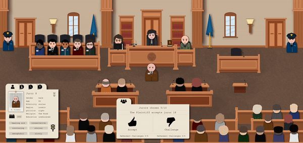 The game is set in a fictional country deeply divided by racial profiling, prejudice, and social injustice. A deep bias runs through the country and its people. Apart from your courtroom skills as a gifted negotiator, it’s crucial for you to find a jury that gives your client a chance Otherwise, every argument and scientific fact might be in vain because no one will listen.