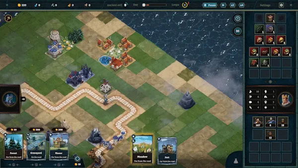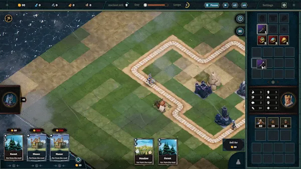 Each turn, you'll receive a set of new cards. Plan building placements carefully on the map. A wide variety of combinations unlock new possibilities for your hero.