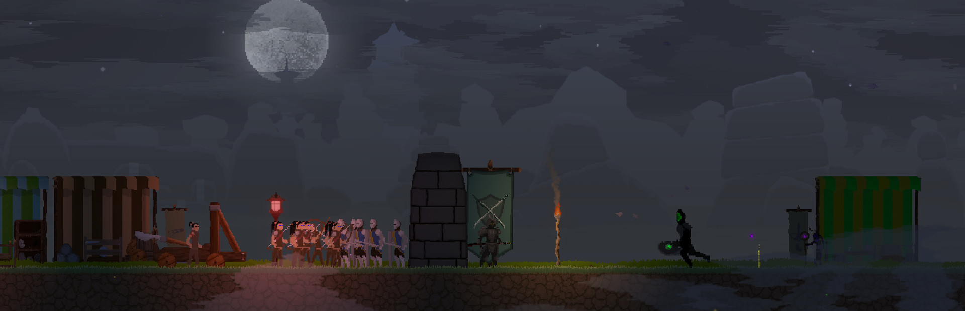 - A 2D pixel art side-scrolling resource management with some action and looting.