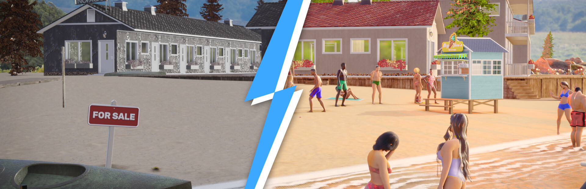 Start your adventure in Lake Resort Flipper by finding a run-down resort that used to be a place filled with happy tourists. Find the perfect place, set a purchase price and take on the challenge. Start with basic repairs, hire staff and consistently improve your management skills. Learn what the entertainment industry is all about and expand into new areas.