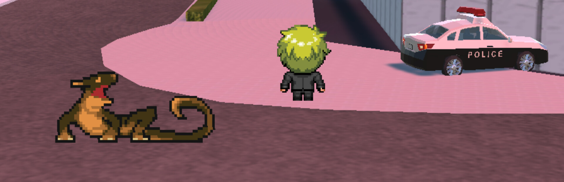 The mysterious graphics of 2D dot-picture characters moving through a 3D space.