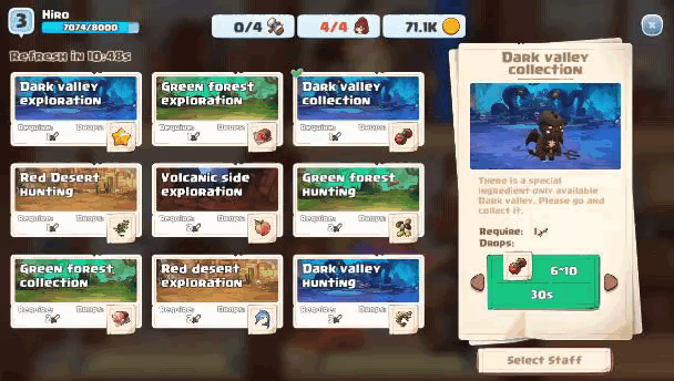 Unlock dungeon and send out your staff for an exploration quest to gather extraordinary ingredients.