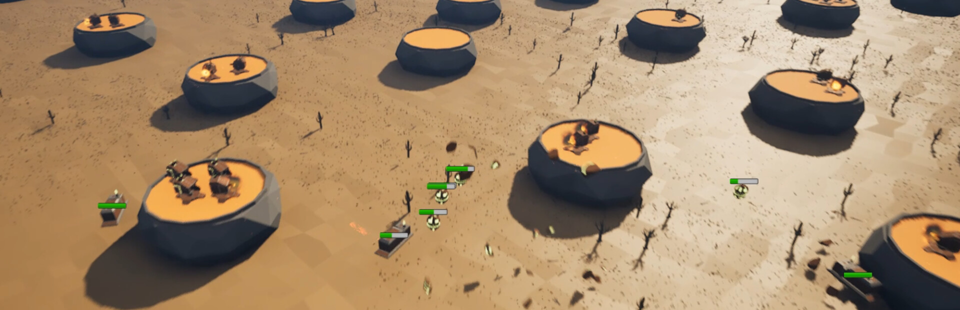 Welcome! After the game has started, simply click on Desert Fight in the Main Menu. Now you can move using WASD. First, you should build resource ships (click on the building directly in front of you). The ships will then fly to the silos and collect resources on their own. You can unlock additional silos - just click on them. Make sure you have enough resources to unlock a silo. Use the resources to build towers on the platforms, which will automatically attack the enemies. The towers have a limited range - try it out. Try to catch all enemies and pay attention to their paths. If you let too many enemies escape, you lose. The enemies appear at the top left in three different locations and then move down to the three caves on the bottom right. There are a maximum of 15 rounds! Good luck!