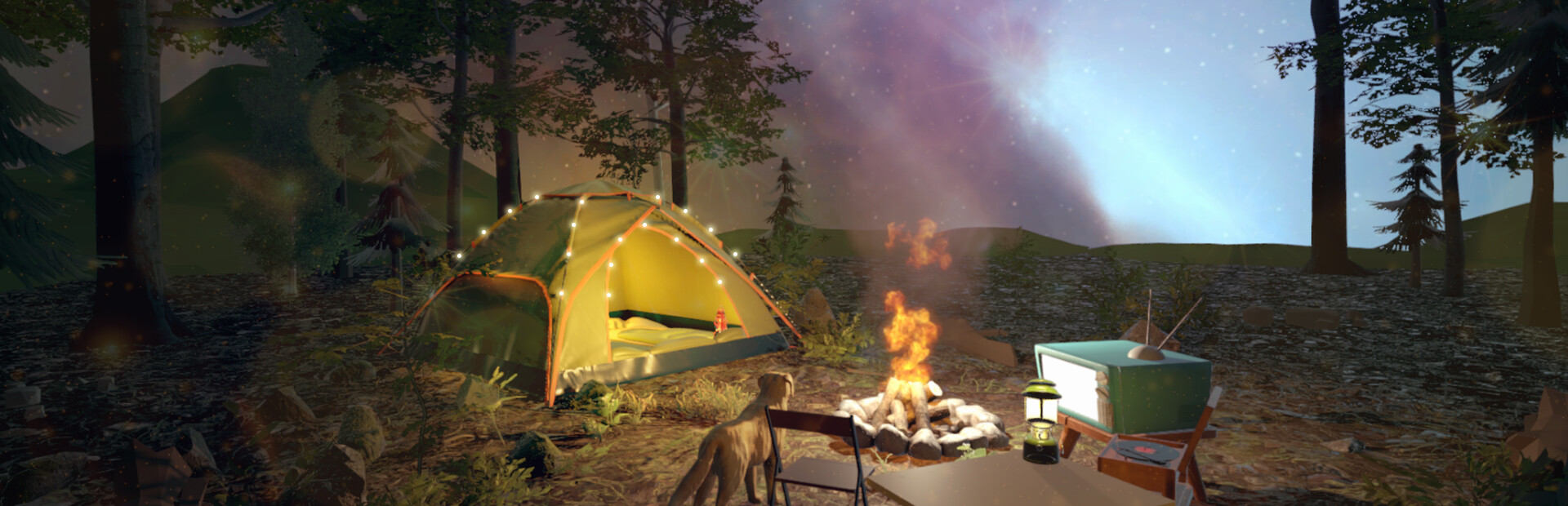 You will enter the dream world following Iru’s story and relax yourself at the cozy forest camping site while watching the camp fire with the dog.