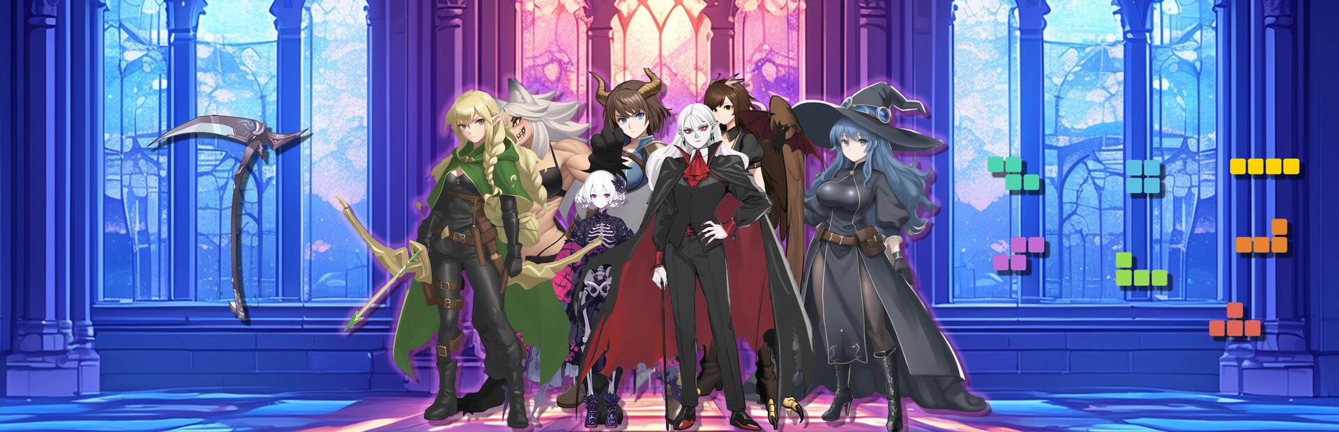 Line up your Tetris! Choose your hero to acquire a block of buyers to match powerful combinations. Then brave Dracula's Castle and go into battle!