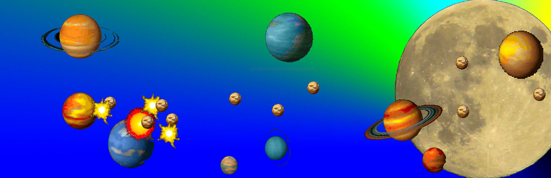 When you want to relieve stress, you should try this game. What you need is just clicking on the white panel. You can feel a sense accomplishment when you reach higher score. Also you can feel refreshing when you hit planets with the moon. There are a lot of ways to enjoy this game. For example, you can play this game to aim the best record by myself. Of course it is great to compete with your friends or family members. I’ll tell you how to play this game. There are two icons whose shape looks arrows on the startup screen. When you click the arrow-shaped icon under “START”, you will move to the practice stage. When you click the arrow-shaped icon under “The explanation screen”, you will get information about the operation.