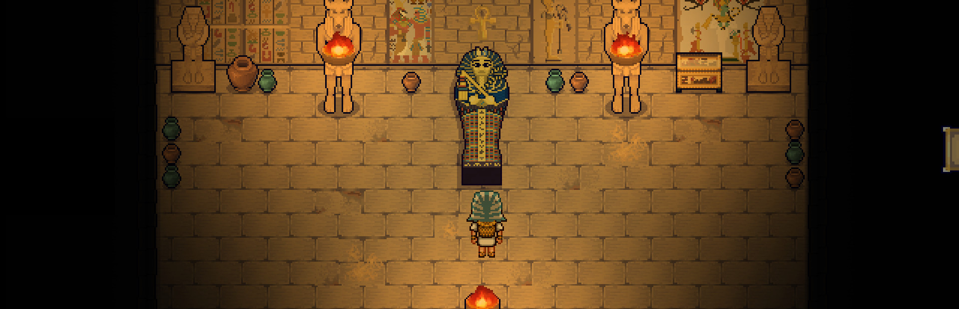 In Nictheroy, the player must gather resources to craft items and build the village that is its home base. Exploring many environments and locations, the player can recruit NPCs to help in the journey and expand the base. With the resources found, the player can make weapons and armours to defeat bosses. Campfires around the world allows the player to rest and save while preparing for new exploration.