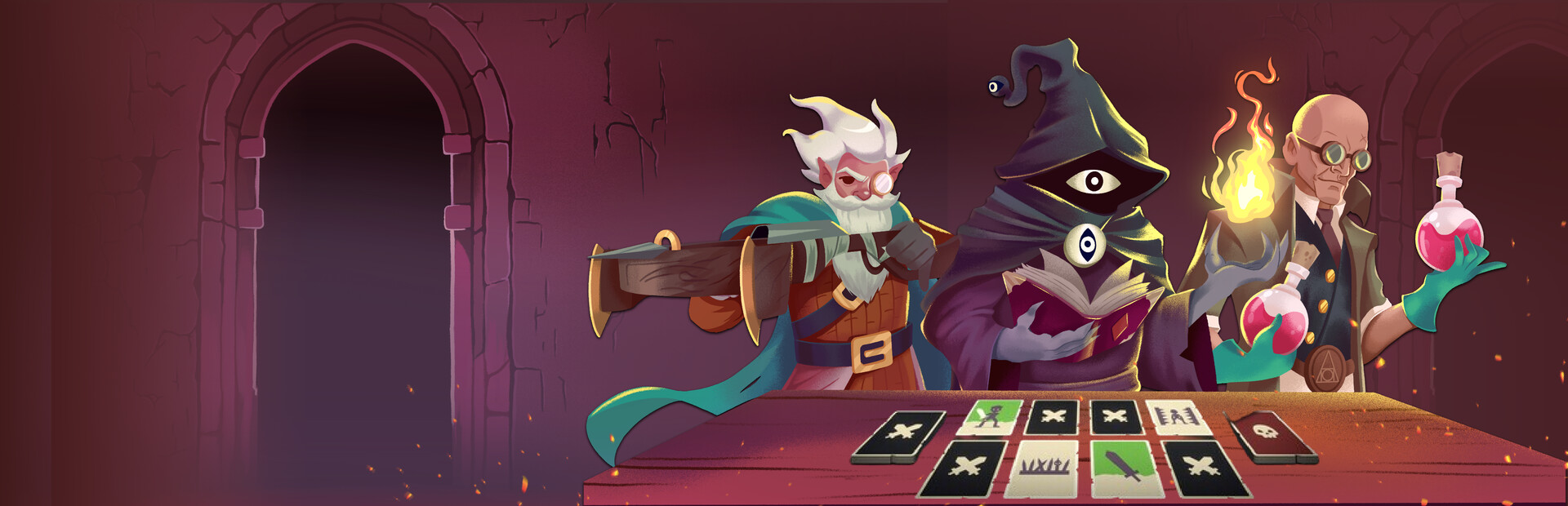 Memorize the cards on the table. Pair heroes with their corresponding weapons to attack enemies and avoid traps at all costs. Traps deal damage and skip your turn. Enemies have their own attack counters that decrease with each passing turn, bringing them closer to attacking.