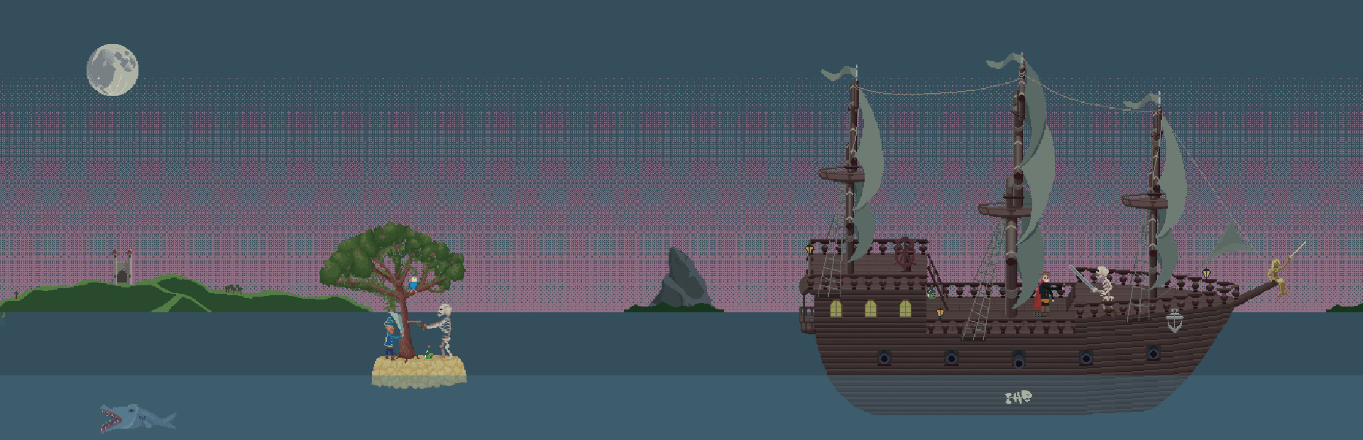 Go on an epic adventure on the Skeleton island! You have to sail on boats, of course drink rum and fight with cursed skeletons. You have to choose a pirate to go through the adventure with the captain. Be brave, mate! Voyage to the Skeleton island where's not anybody stayed alive. Search treasures while discovering islands, and spend them improving abilities and buying your own pet! Discover atmospheric islands's flora and fauna, architecture and its history, passing through the storm. Swim under water and search chests full of gold through corals. And reveal the damned island's secret!