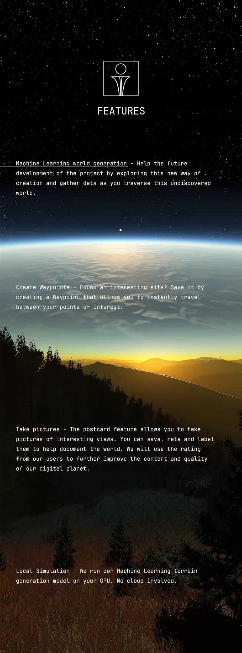 Preface is an immersive tech demo showcasing Melba, PLAYERUNKNOWN Productions' groundbreaking technology generating an Earth-scale world. In this project still in development, experience our Machine Learning agents creating a dynamic planet in real-time, all processed directly on your GPU - with no reliance on cloud services.