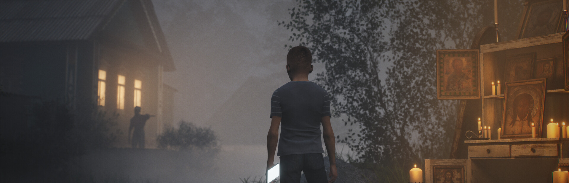 Escape from the monster in the circle of the holy altar. Find matches by exploring the village and light the candles on the altar to activate the protection.