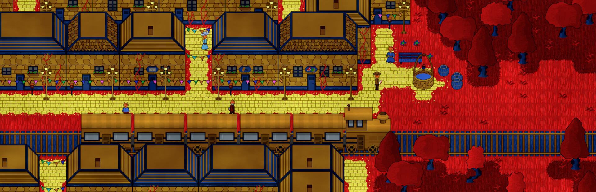 Red Lands takes place in a colorful world where the grass is red, the wood blue and the stone yellow. These lands are still largely unexplored and only populated by cats in some small tows connected by railroads. Despite its cute appearance, the nature there is harsh and filled with dangerous animals.