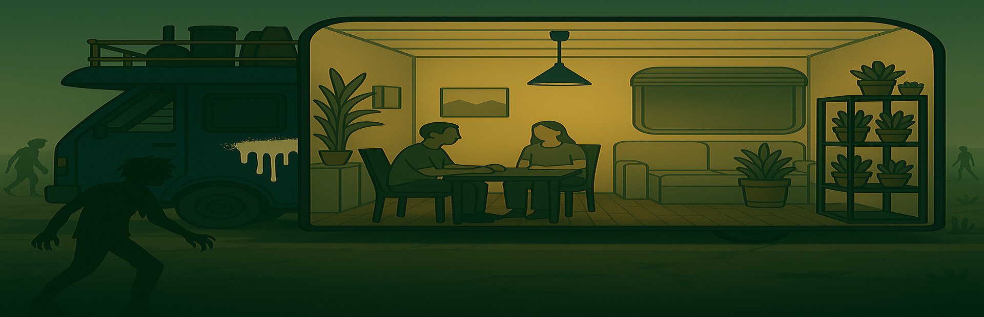 In a post-apocalyptic wasteland, you drive a lone RV north, chasing the faint hope of survival. Deadly weather, lethal viruses, and relentless zombies make every trip outside a gamble with your life.