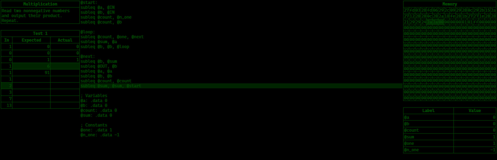 It's an assembly language zachlike for everyone! New programmers will appreciate how few unique instructions there are to learn (just one!), and experienced programmers will appreciate how poorly suited this one instruction is for writing straight-forward programs.