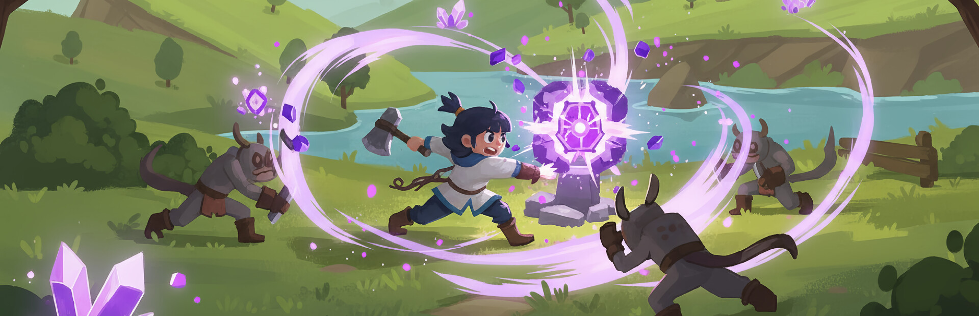Your goal is to strengthen the Lodestone, by forging it with Magnetite. Harvesting it is tough work, however. You must venture across the Endless Sky, find other Islands, and... steal their cores.