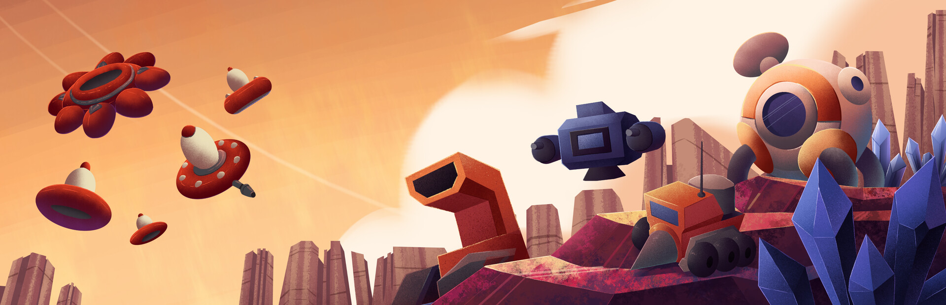 Harvest glowing blue gems from the planet's crust to construct an army of mining bots, defensive- and combat units. Fend off endless waves of alien enemies who drop green gems upon defeat — your key to unlocking new planets and tougher challenges.