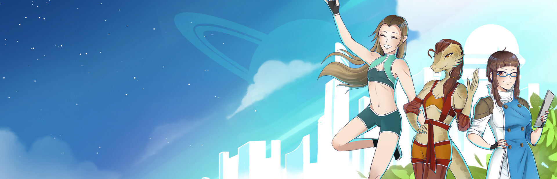 You play as Ezra Foy, a young twenty-something coming out of their senior year at university. For Ezra, it feels like time had stopped: the war effort was all anyone could focus on, and now that peace has finally been won again, the time for revelry and relationships has begun. Choose between three love interests, each with their own deep branching storylines and hundreds of lines of dialogue; enjoy a futuristic setting involving people and places of all different walks of life, including a friendly lizard-like alien species known as the Ghians; and decide what the best course of action should be living in a post-war era, and what we as individuals can do for our future.