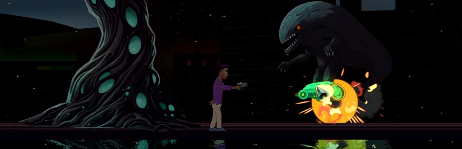 In the neon-drenched depths of Hollow Earth's bustling downtown, you’re not the hero, you're the secret to his survival. The nightlife is alive with pulsating beats, eerie shadows, and hovering cars, but your companion, a party-loving resident caught in the chaos and can’t move without you.