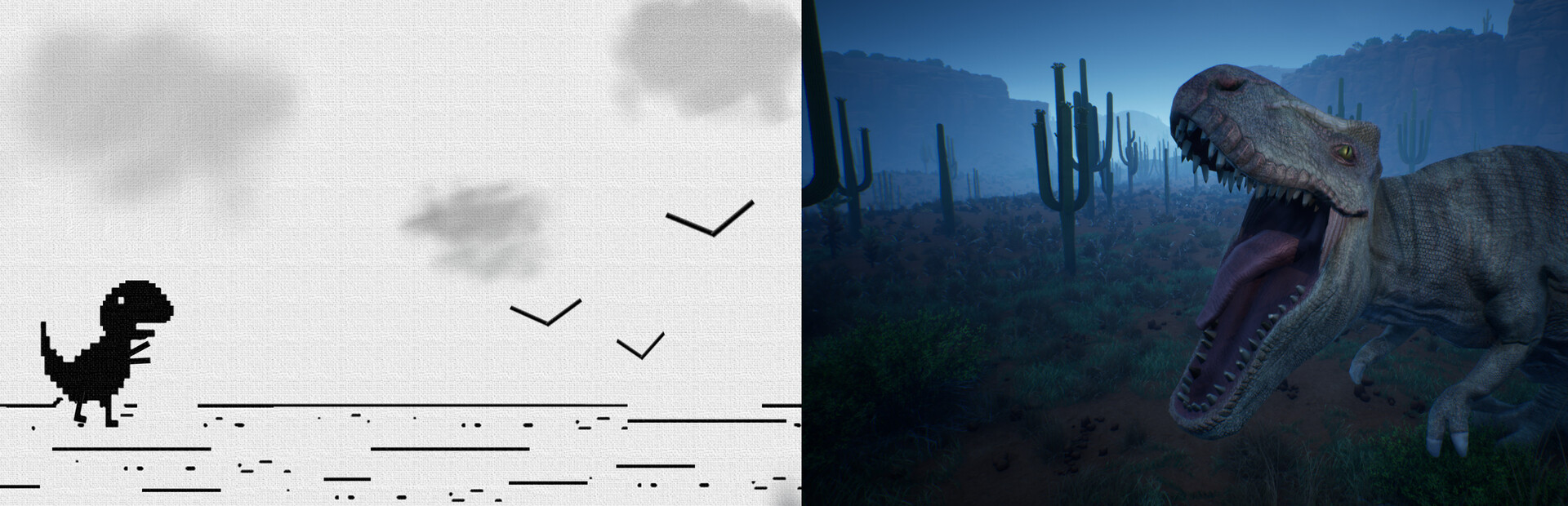 T-REX Dinosaur Game is a runner that uses the full power of Unreal Engine graphics. The rules of the game are very simple. You play as a Tyrannosaurus Rex that runs through the desert. Cacti will come across on your way, which you need to jump over in time. If you couldn't react - you lost. This is the whole gameplay. If you jump well enough, you can play as much as you want. The desert is looped, and you can run through it endlessly.