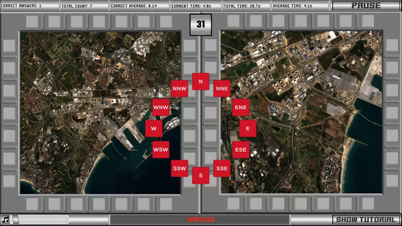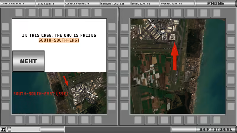 Included in both the TBAS and ASTB-E, this test measures and improves your ability to determine your aircraft's heading with nothing but your directional orientation shown on a map. In the test, a map is shown with your aircraft's heading depicted as an arrow. On the right side of the screen is a display showing a top-down visual of buildings from your perspective in the aircraft. Simply select the correct building when prompted based on the directional orientation shown on the map.