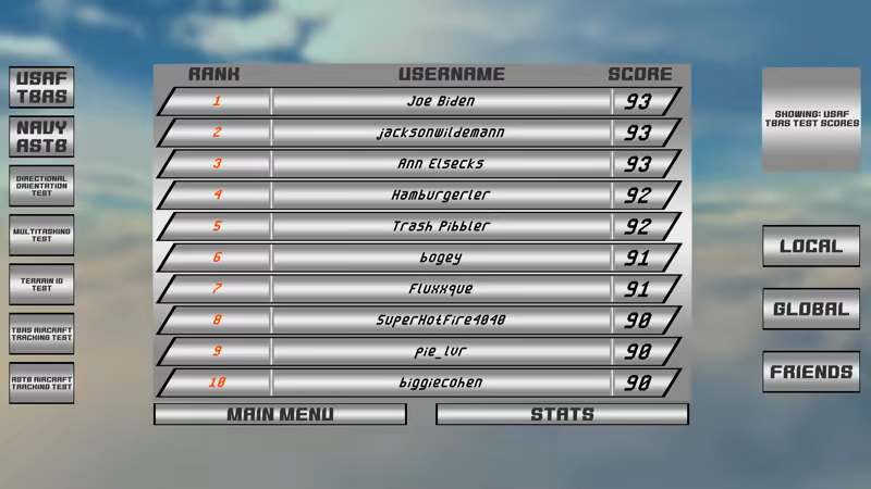 - LEADERBOARDS: Compare your performance with your peers! Did you get a score and you're not sure how good it actually is? Take a look at the worldwide statistics for the assessment mode or for each individual test and see if you have what it takes to out-compete other prospective pilots! If you ever find yourself in the number one spot, you can rest assured that you're built from the stuff pilots are made of!