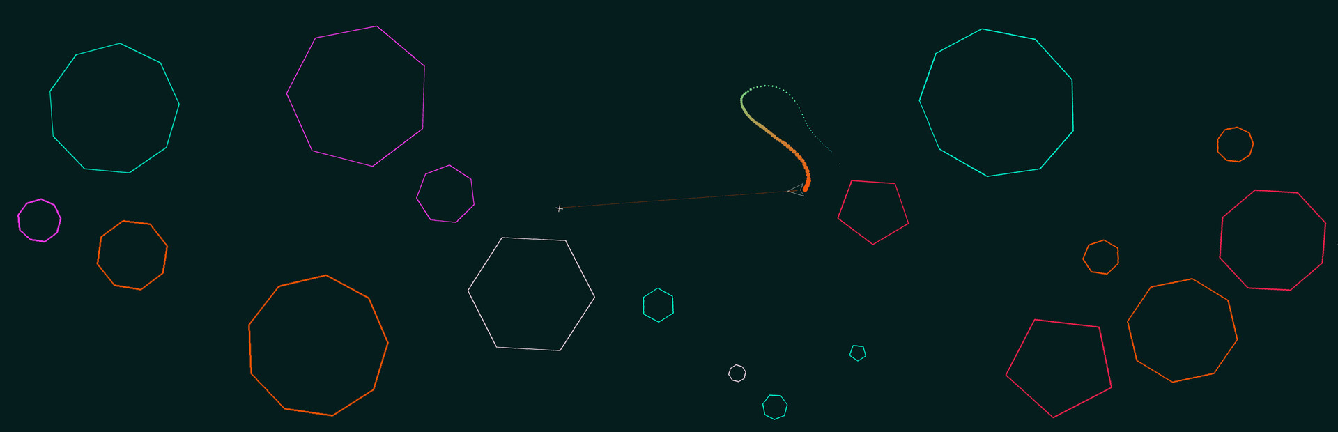 You start off in a quite empty two dimensional plane of space, you can move around any direction your facing. Then suddenly you are quite likely to encounter some polygon asteroids, make sure to not bump into these.