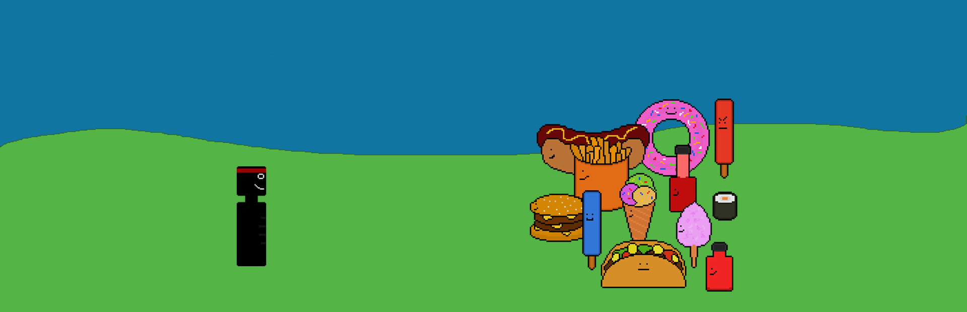 It's a rougelike with a little bullethell gameplay on top. In this game you control a character that is fighting against mainly junk foods, in hope it can escape from the dungeon. While he collect items and mysterious things to increase or decrease his chance of escaping.