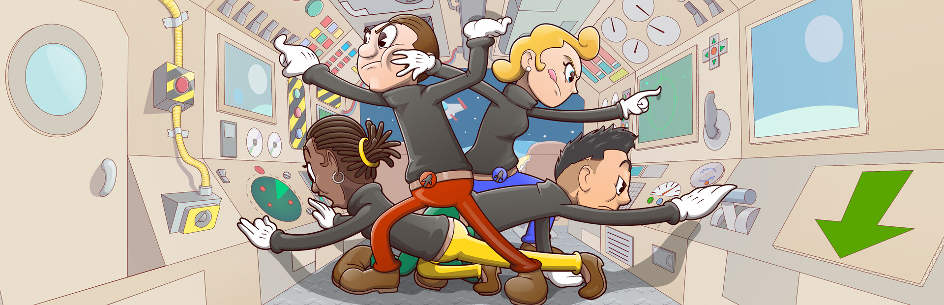 A chaotic cooperative space simulator where four players control captains in a specific role. Unfortunately, the space corp you are a part is limited in operational space, so each captain much share their instruments.